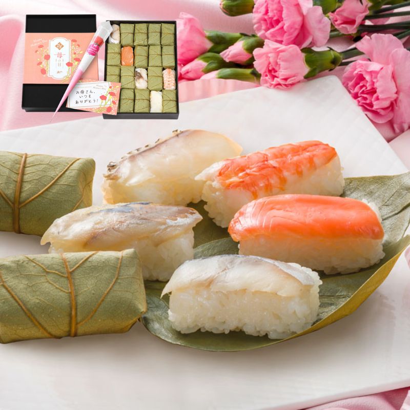 ゐざさ一番人気の柿の葉寿司詰合せを【母の日限定仕様】でお届け。メッセージカードと造花のカーネーション付き。