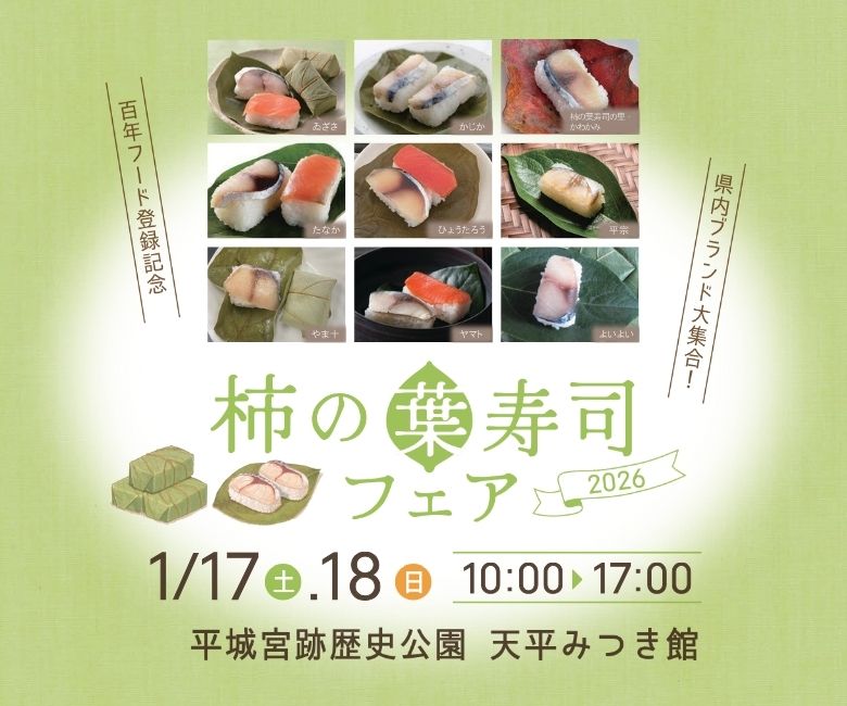 奈良県内の柿の葉寿司メーカーが集まる「柿の葉寿司フェア2026」が2026年1月17日(土)、18日(日)の2日間、平城宮跡歴史公園 天平みつき館(奈良市)にて開催されます。