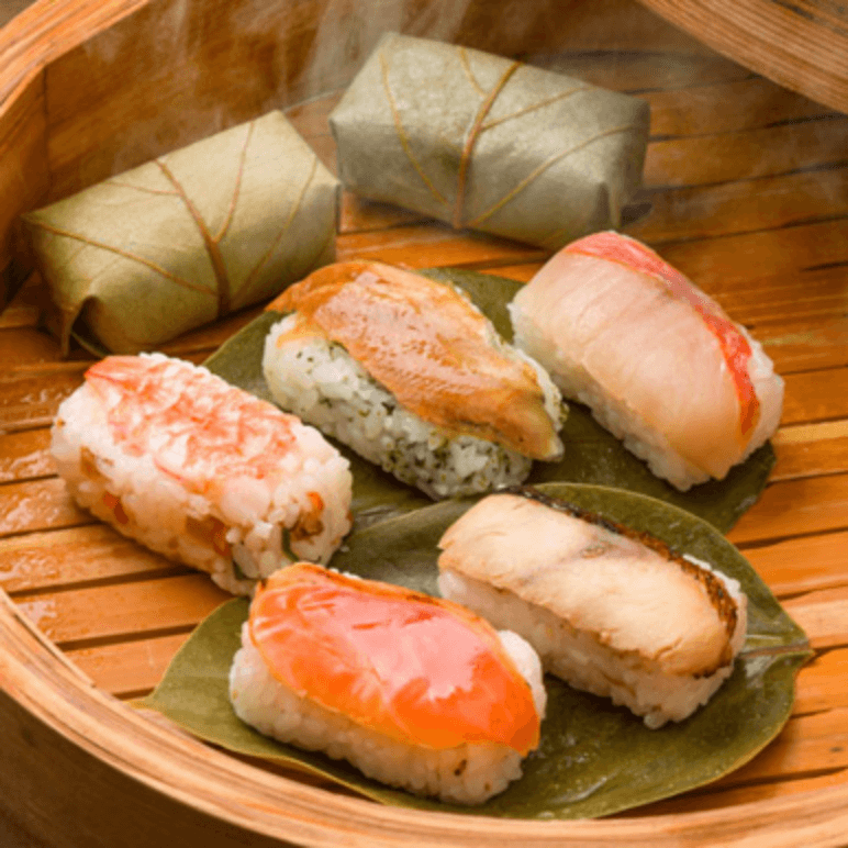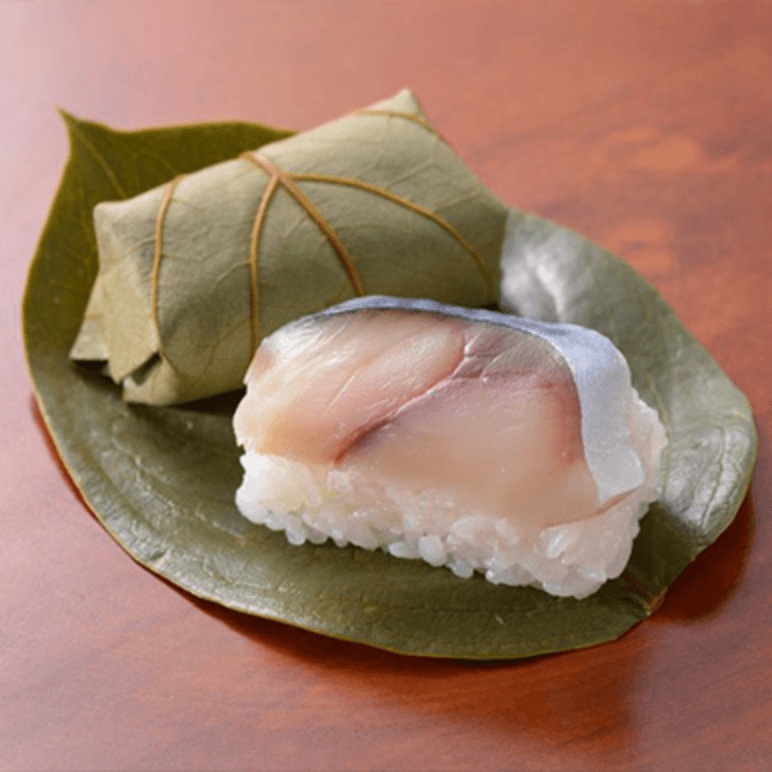 By wrapping the sushi in persimmon leaves and pressing it with a weight, the flavors gently meld together and the sushi becomes more suitable for keeping. Another distinctive feature is the subtle, refreshing aroma of the persimmon leaves.